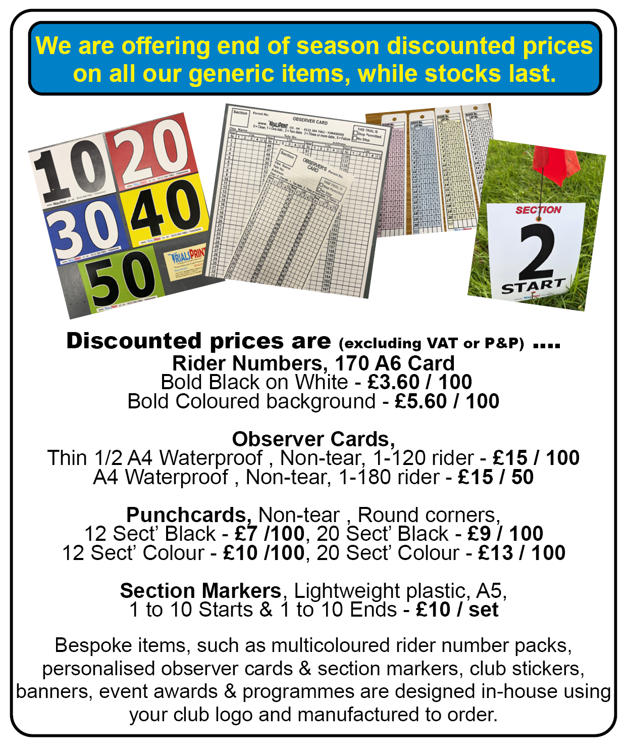 Motorcycle Trials Clubs are supplied with various items from Kudu, NOW Trading as Trials Print, These items are generally despatch within 3 working days to any UK address at cost .